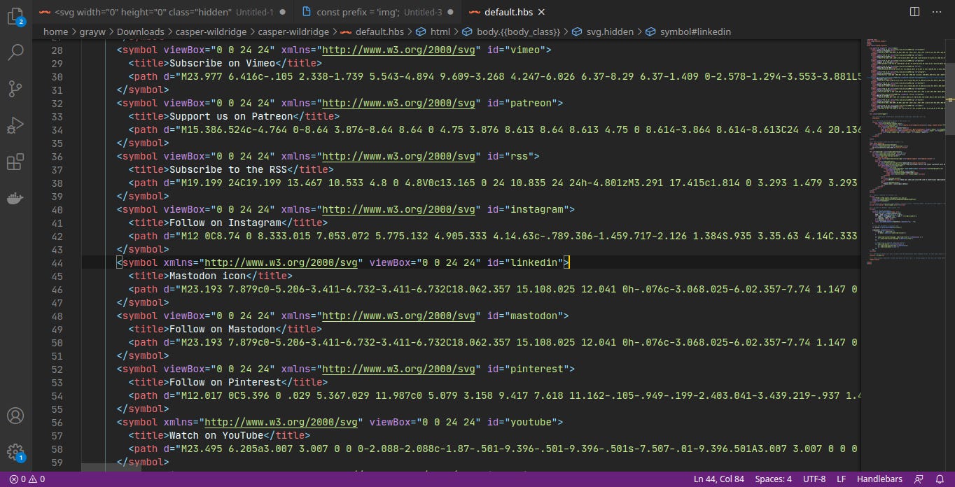 },Now we need to put all this SVG info in to the default.hbs file immediately after the opening <body tag> in the following format with each entry between a <symbol> </symbol> and the relevant properties: